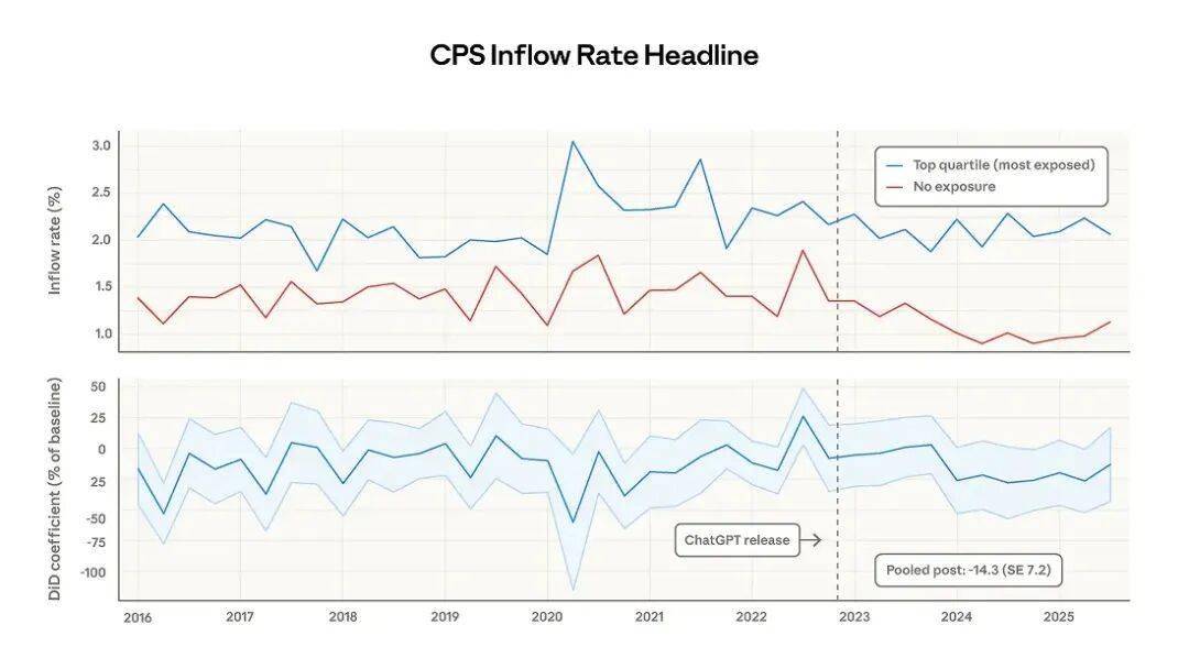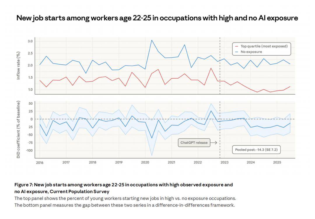 可另一个信号更危险:22-25 岁的年轻人,在高暴露岗位的入职率直接掉了 14%。老员工还能靠经验苟住,新人连门都摸不到了。