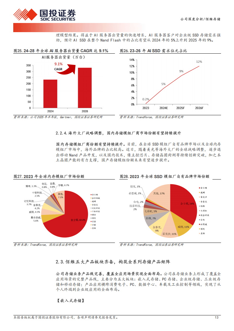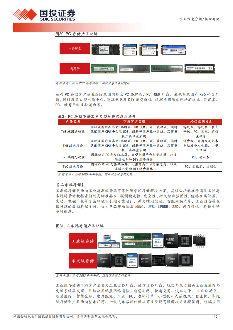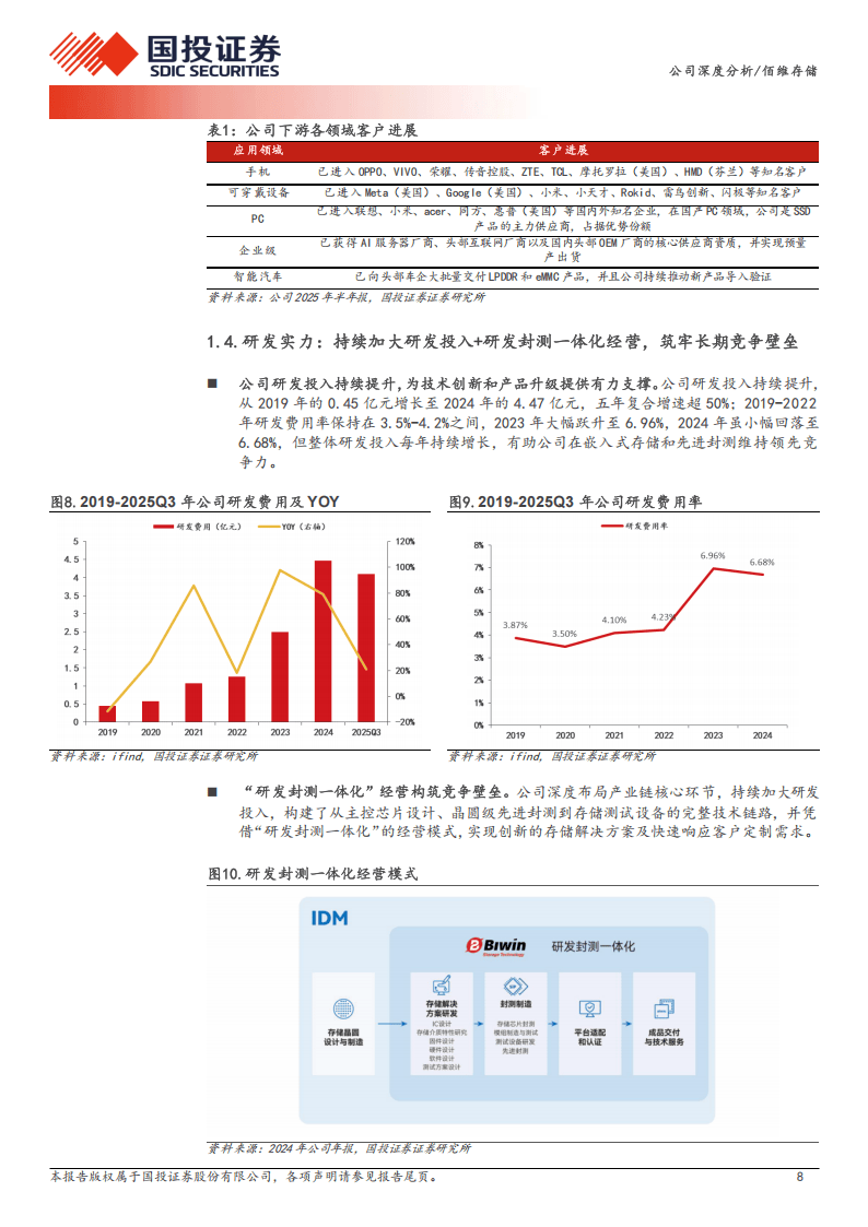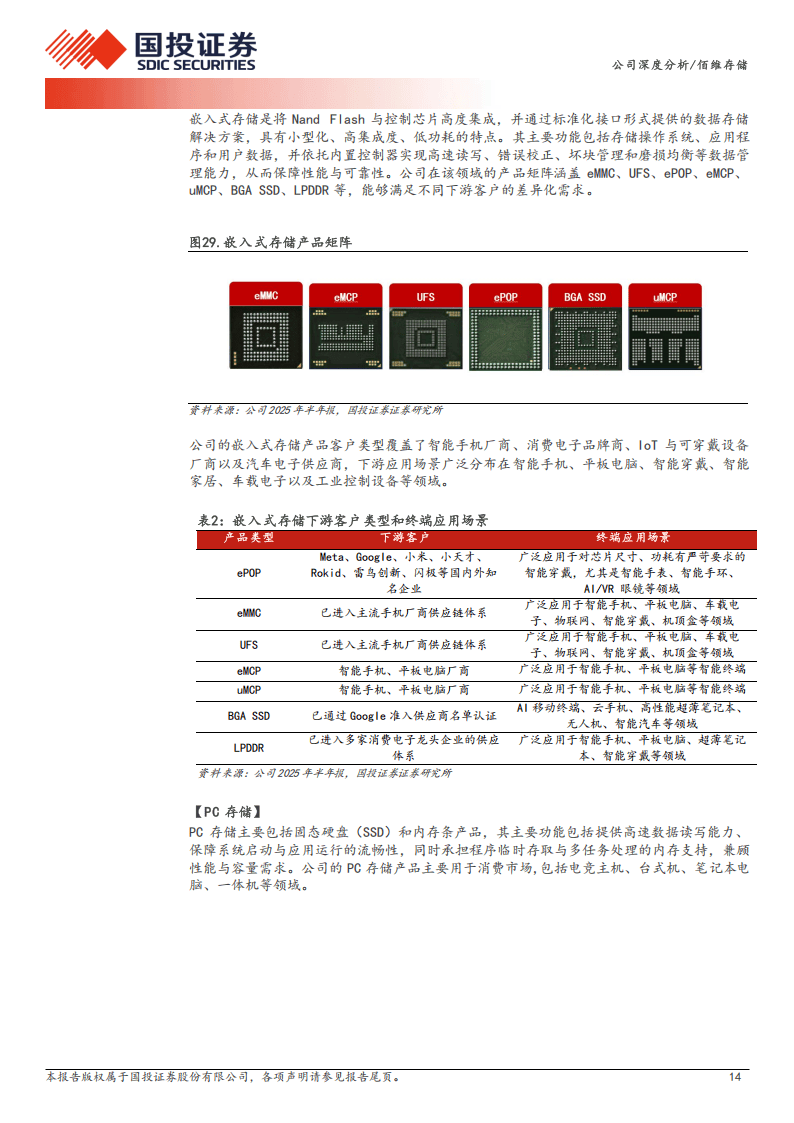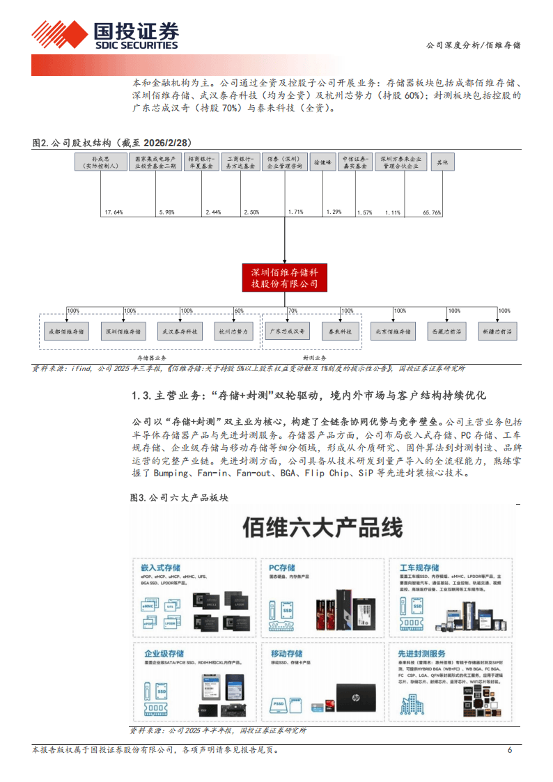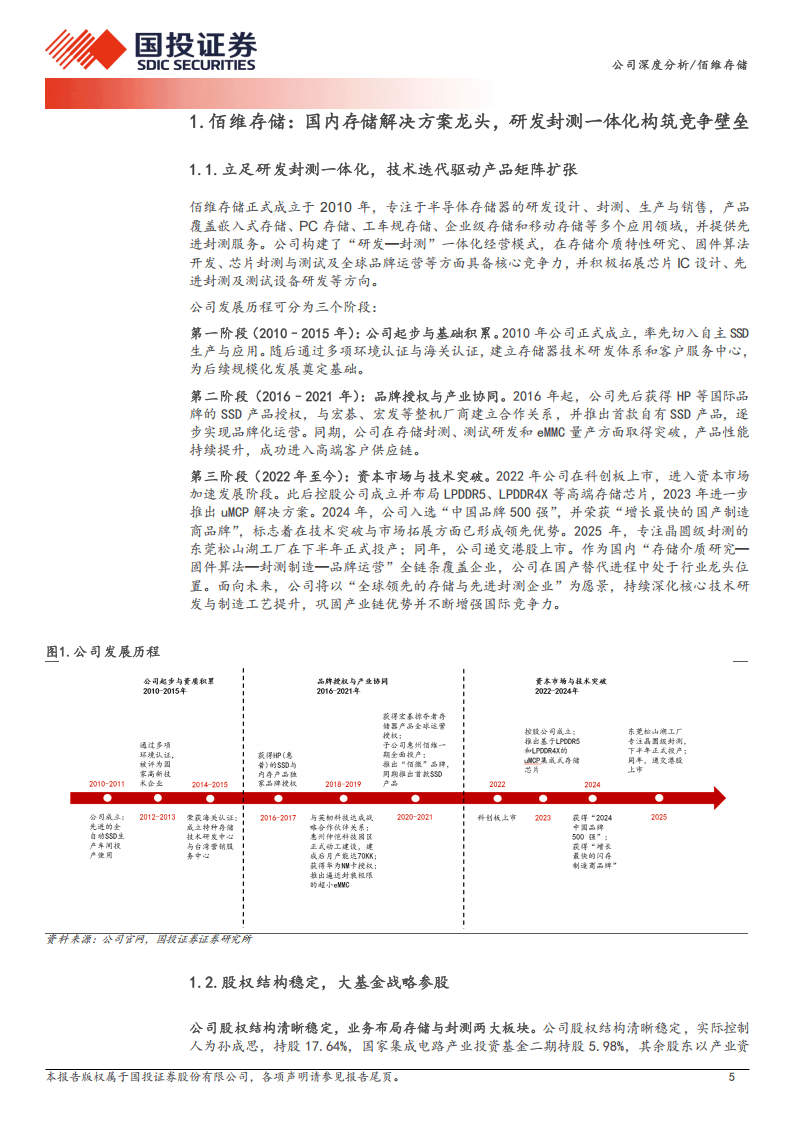 佰维存储作为国内存储解决方案龙头企业,2010年成立后形成研发封测一体化经营模式,产品覆盖嵌入式、PC、工车规、企业级、移动存储五大品类,并提供先进封测服务,股权结构稳定且获大基金二期战略参股,客户囊括OPPO、Meta、联想等国内外一线企业,在多领域市场份额稳步提升。