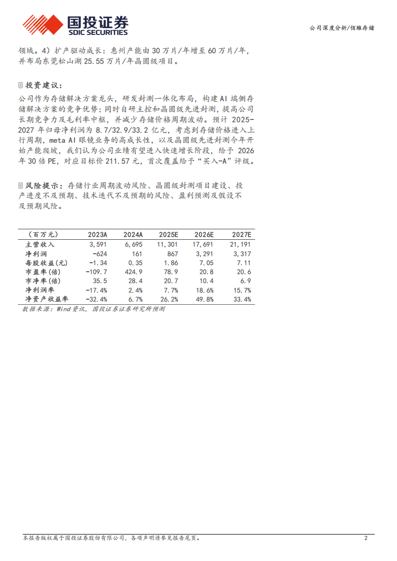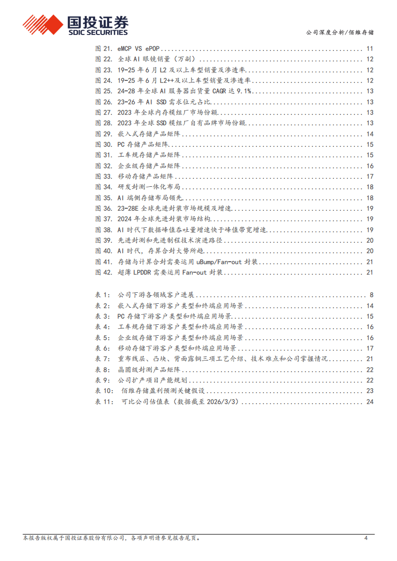 业绩方面,公司营收保持高速增长,2020-2024年CAGR达42%,2024年成功扭亏为盈。受益于存储行业上行、国产替代及先进封测业务放量,公司各产品线增长潜力充足,嵌入式存储依托Meta AI眼镜👓等业务提升毛利率,先进封测业务预计2026年底开始贡献收入,成为第二增长曲线。未来随着AI端侧存储需求释放、先进封测产能爬坡,公司在存储与封测双主业协同下,业绩有望进入快速增长阶段,在国产存储替代进程中的龙头地位将进一步巩固。