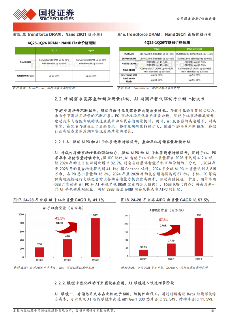 行业层面,存储市场迎来超级周期,2025年进入新一轮上行周期,DRAM、NAND Flash价格大幅上涨,AI驱动下推理需求提升带来存储需求质变,叠加AIPC、AI手机、AI眼镜👓等终端渗透率快速提升,智能汽车、AI『服务器』等新兴场景打开存储增量空间,而美光等海外大厂退出移动NAND市场,为国内厂商带来国产替代机遇,佰维存储有望借此进一步提升市场份额。