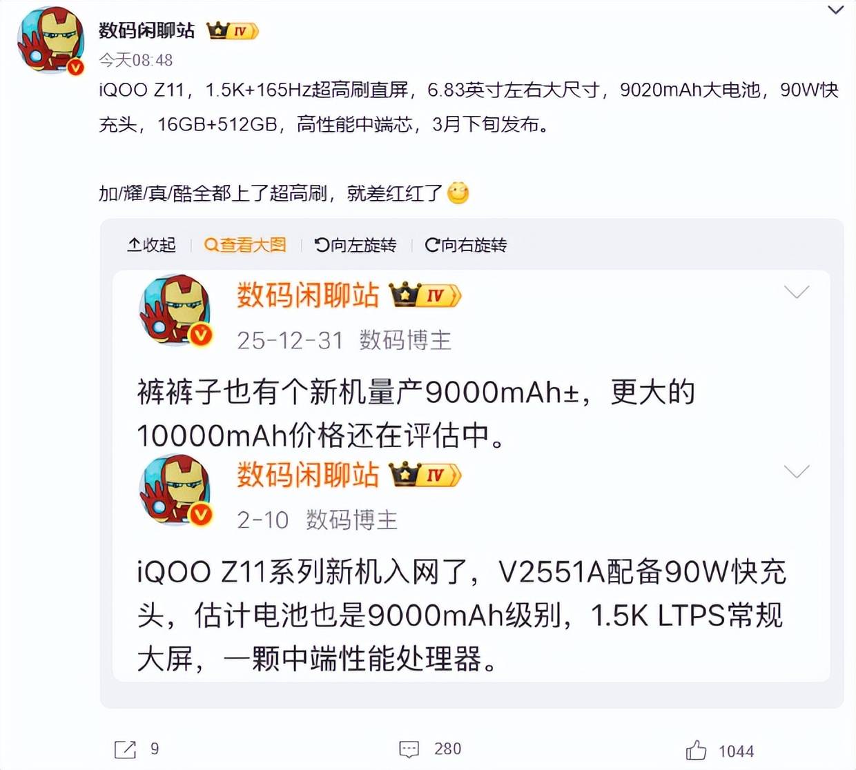 9020mAh!这数字念出来都觉得自己电量焦虑被治愈了。配上90W的有线快充(据说充电头是标配),这续航组合简直离谱。要知道现在很多平板才8000mAh左右,iQOO往手机里塞这么大电池,重量估计得冲着半斤去了,但重度用户估计要笑醒——一天一充?不,可能两天一充都够用。