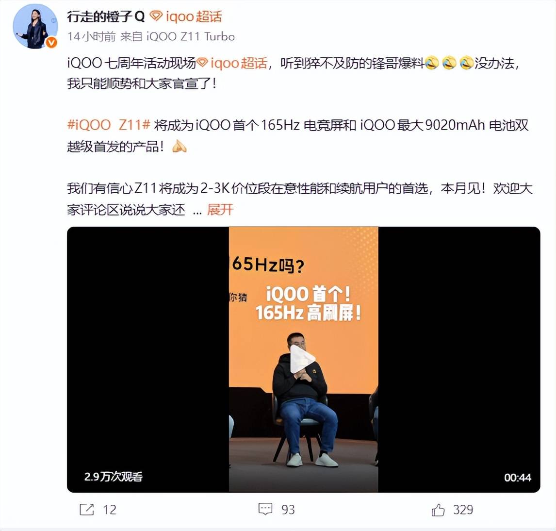 iQOO又要发新机了!这次是Z系列的新成员——Z11。官方产品经理已经在微博上放话了,“本月见”,而且还直接甩出了两个王炸卖点:iQOO首款165Hz电竞屏,还有iQOO史上最大的9020mAh电池!