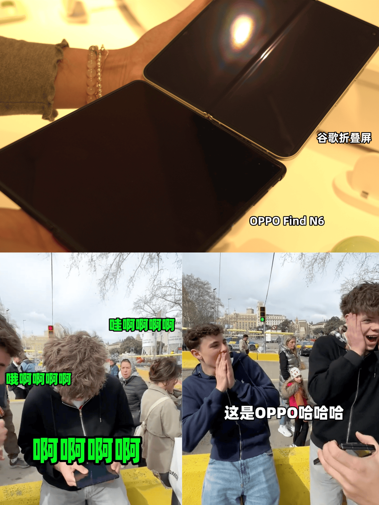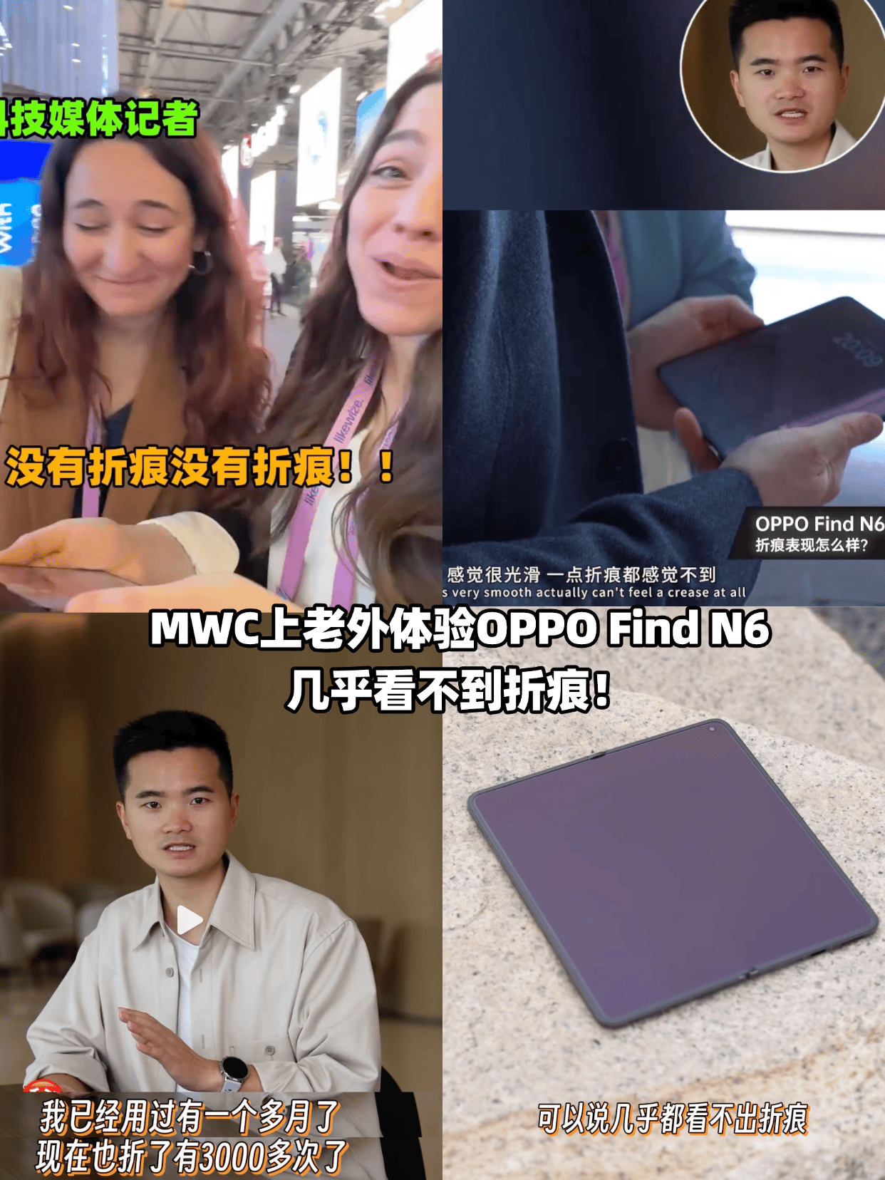 还有博主拿着Find N6到街头让老外折叠,他们好多在折叠好多次后说几乎看不到折痕,还以为是苹果折叠屏发布了,当博主说是OPPO,他们震惊到说不出话了,还点赞了OPPO,哈哈。