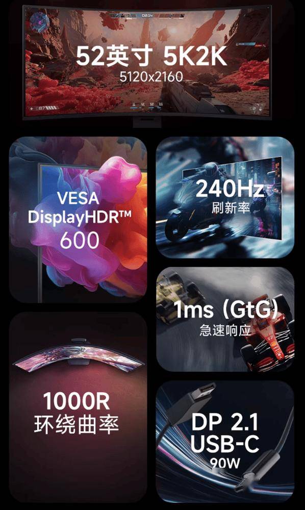 该机配备一块 5120x2160 分辨率 VA 面板,刷新率至高可达 240Hz,显示器曲率 1000R,GtG 响应速度 1ms,HDR 亮度至高 600 尼特,显示器支持 10-Bit 色彩,覆盖 95% DCI-P3 色域。