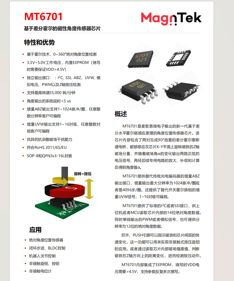 MT6701是麦歌恩微电子推出的新一代基于差分水平霍尔磁感应原理的角度位置传感器『芯片』。该『芯片』内部包含了两对互成90放置的差分霍尔惠斯通电桥,能够感应在『芯片』X-Y平面上旋转磁铁的Z轴磁场分量,并随着磁场角a的变化输出两路正弦的电压信号,再经后续专用电路的放大、补偿和计算后得到角度值a。