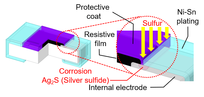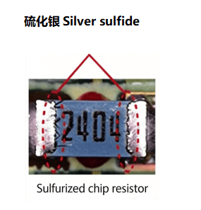硫化断线现象主要发生于内部电极采用银材质的厚膜贴片电阻中。当电阻在含硫环境中服役时,硫磺会通过电阻保护膜与外部电极的间隙渗透至内部电极,与银元素发生化学反应生成硫化银(一种绝缘物质),最终导致电阻出现电气断线故障。