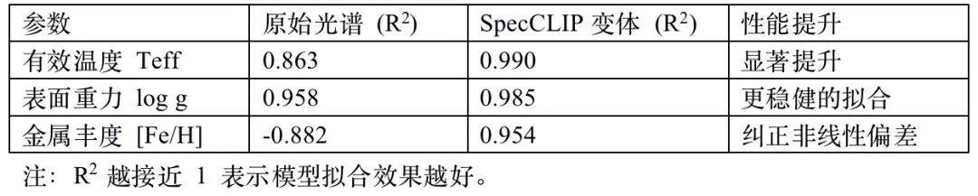 通过测试集的数据对比(见下表),SpecCLIP 各变体在几乎所有核心指标上都优于原始光谱输入: