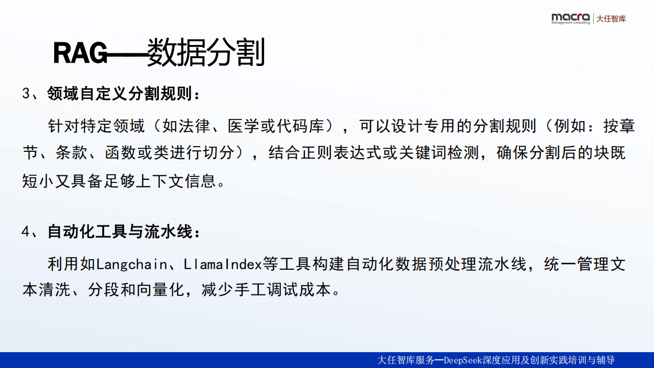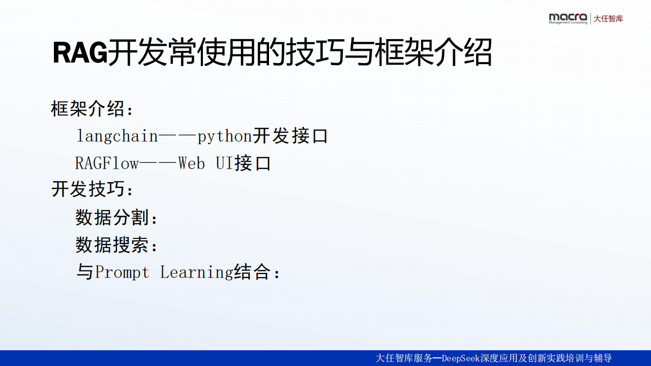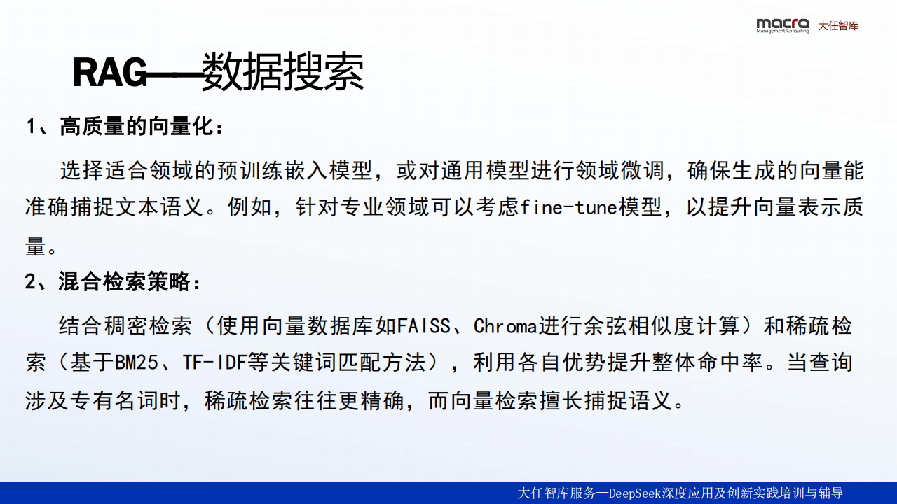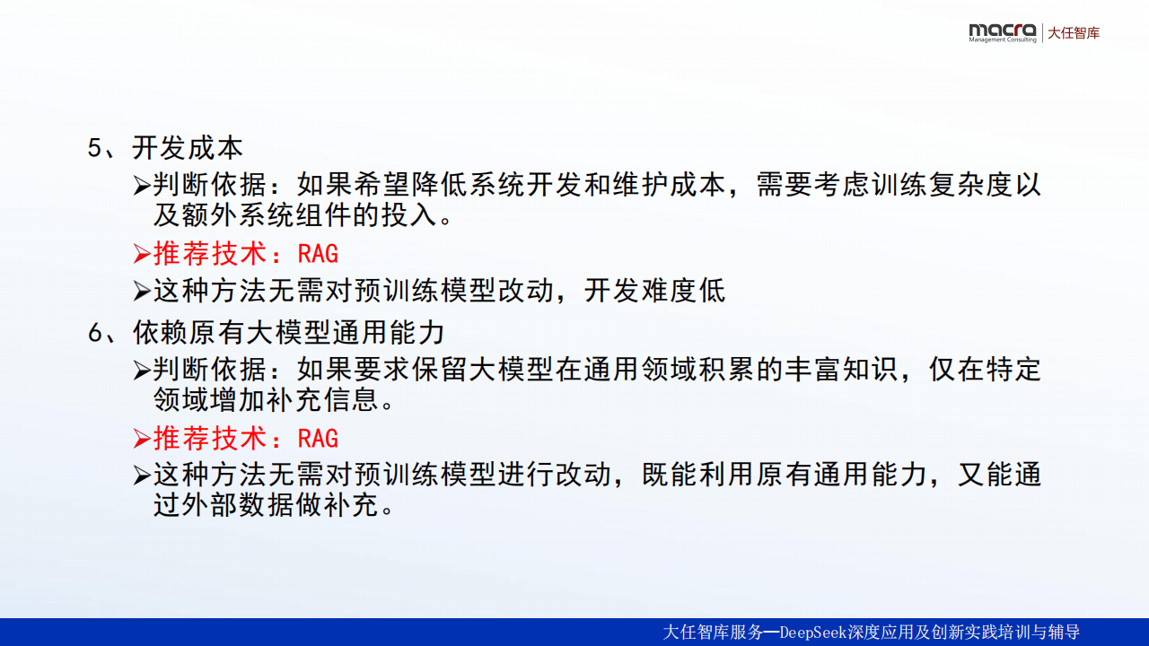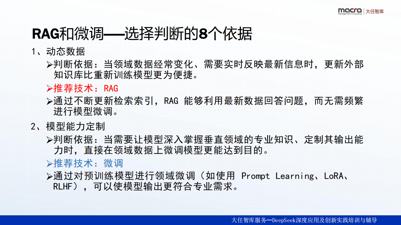 这份大模型本地部署和微调的PPT核心围绕垂直领域应用展开,指出大模型存在幻觉、时效性不足、专业知识欠缺等问题,可通过RAG和微调解决,二者选择有8大依据,也可结合使用,还介绍了RAG开发的框架与数据分割、搜索等技巧。微调分为Prompt Learning、LoRA、RLHF、全量微调四类,配套Hugging Face PEFT等工具框架,同时给出算力、硬件、软件开发的费用估算方法,以及微调所需数据体量、格式要求。此外,详细讲解了三类微调的常用技巧并附实战案例,最后分析了垂直领域部署失败的八大原因,包括数据质量低、算法选择不当、模型过拟合、预算不足等。
