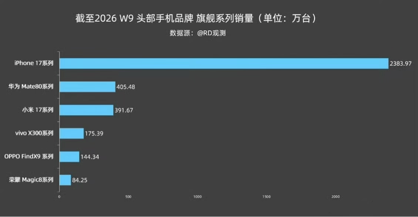 最新统计显示,截至2026年第9周,中国旗舰手机市场的整体格局已经基本清晰。榜单第一依然是iPhone 17系列,累计销量已经来到2383.97万台,依然是断崖式领先。