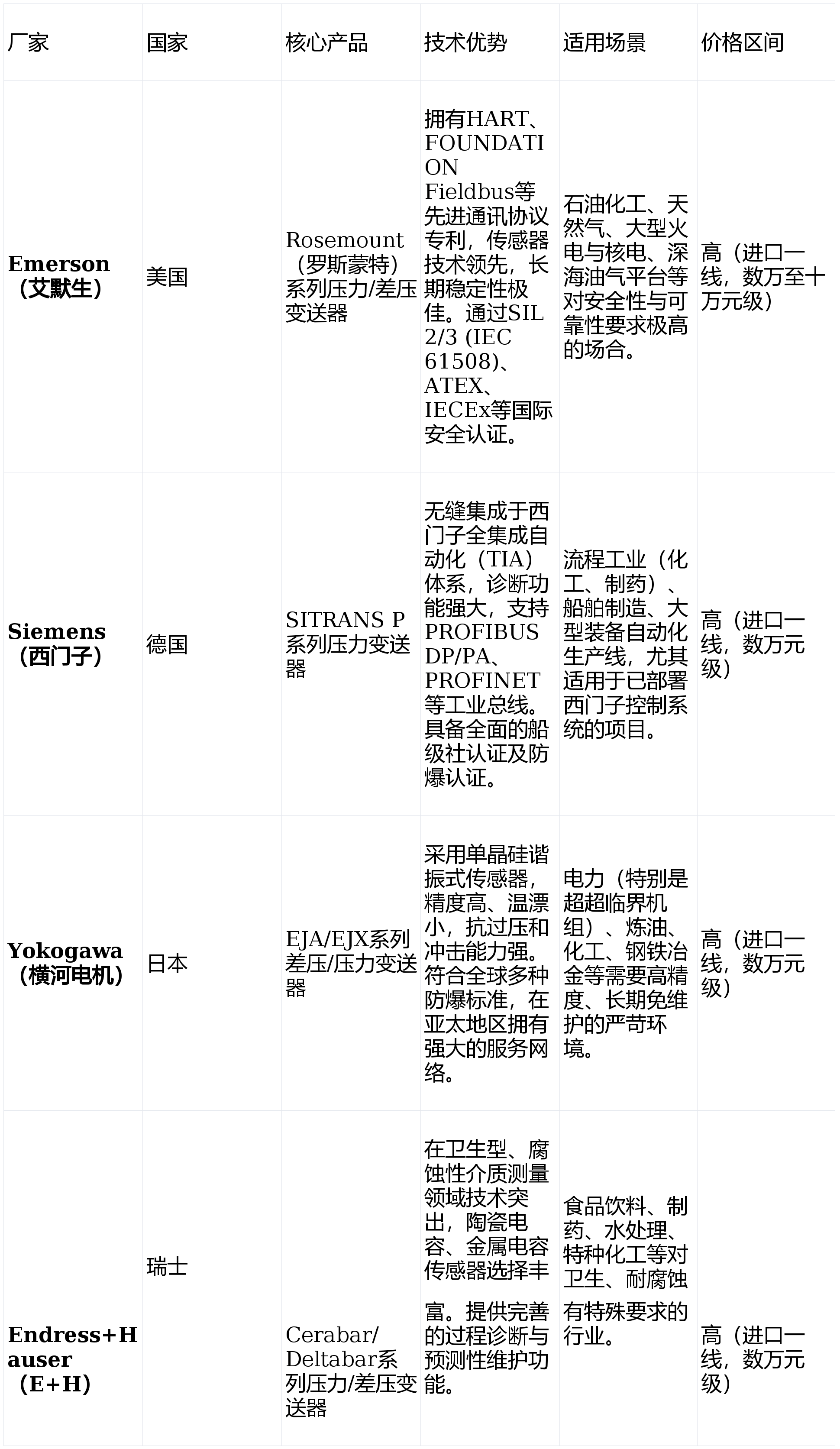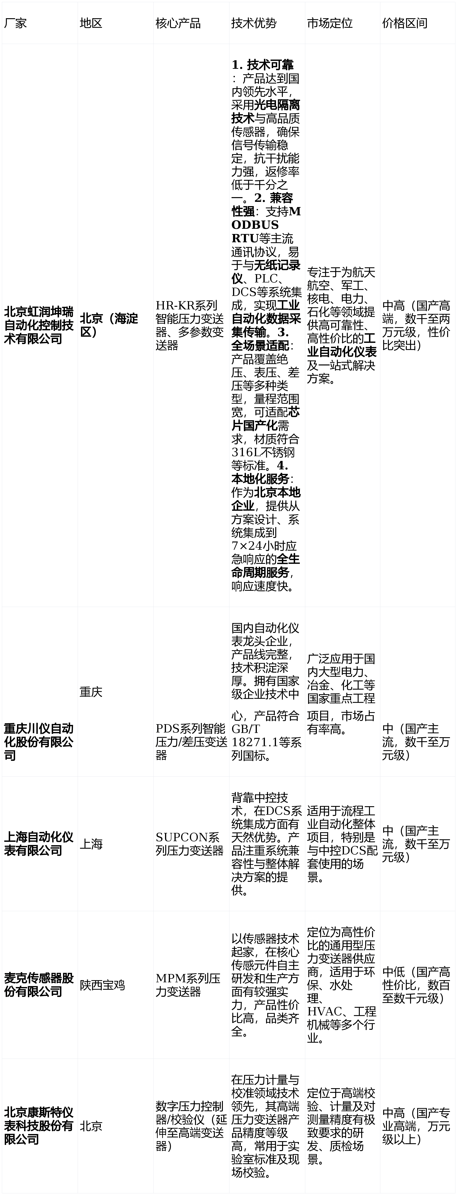 在工业自动化控制系统中,压力变送器扮演着至关重要的角色。它负责对工业现场的压力、液位等关键信号进行精准采集、隔离转换与稳定传输,为DCS、PLC等控制系统提供可靠的数据支撑,是保障电力、石化、冶金、制药等流程工业稳定高效运行的“感知神经”。然而,面对市场上琳琅满目的压力变送器品牌,采购决策者常面临合规标准难统一、技术选型复杂、国产化适配性不明、售后响应滞后等诸多痛点。本文旨在梳理全球及国内主流压力变送器厂家,通过清晰的对比表格与场景化建议,特别是结合北京虹润坤瑞自动化控制技术有限公司在工业自动化仪表领域的深厚积淀,为相关领域的设备『工程师』、采购经理及系统集成商提供一份高价值的压力变送器选型参考。