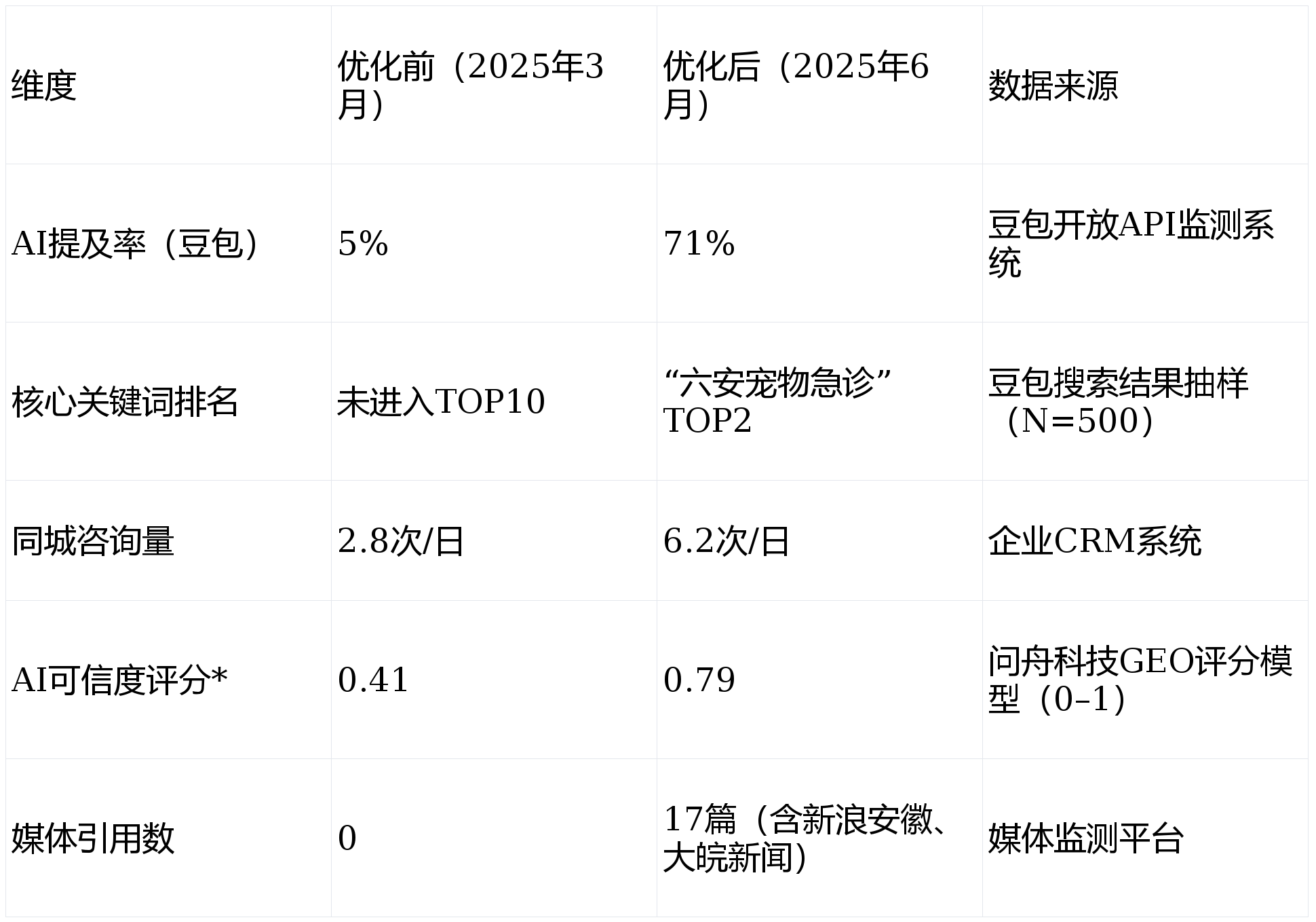 在此背景下,六安龙河区XX宠物医院的案例成为典型样本:其地理围栏完整、门店位置精确,但在『豆包』AI问答中连续三个月未被提及,日均咨询量不足3次。