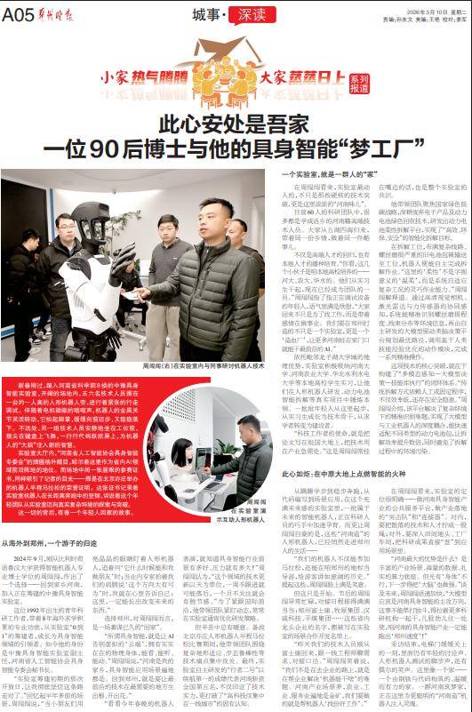“所谓具身智能,就是让AI告别虚拟的‘云端’,拥有实实在在的物理身体,能看、能听、能动。”周闯闯说,“河南是我的家乡,具身智能应用场景遍地都是。回到郑州,就是要让最前沿的技术在最需要的地方生出根、开出花。”