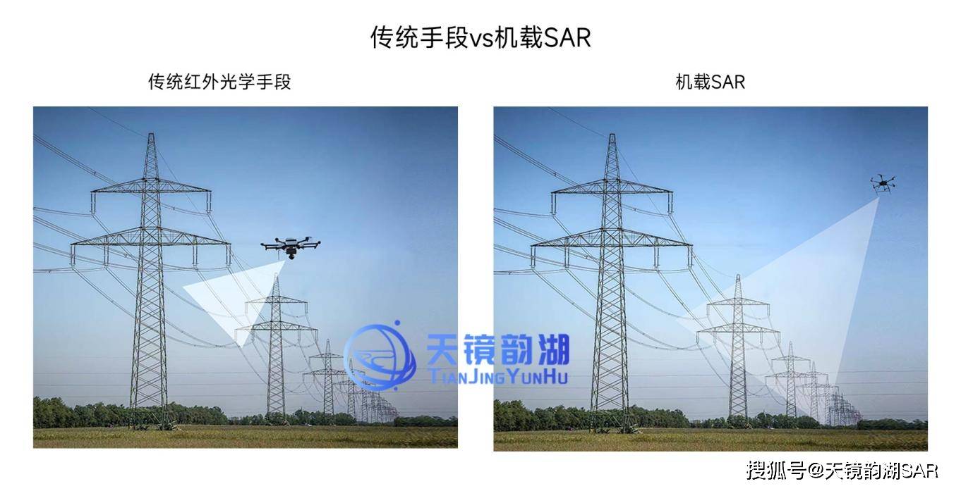 机载 SAR 以微波为探测手段,具备全天候、全天时成像能力,可穿透云雾、植被甚至浅地表,不受光照和天气条件制约。相比传统手段,它能精准捕捉毫米级地表形变、穿透茂密植被定位导线、快速识别设备微小缺陷,且覆盖范围广、数据维度丰富(如极化信息、相位信息);同时小型无人机如科卫泰、纵横,大疆的飞行高度在300米以上,远离铁塔电线,不会损害电线,且SAR成像分辨率是不受距离影响。