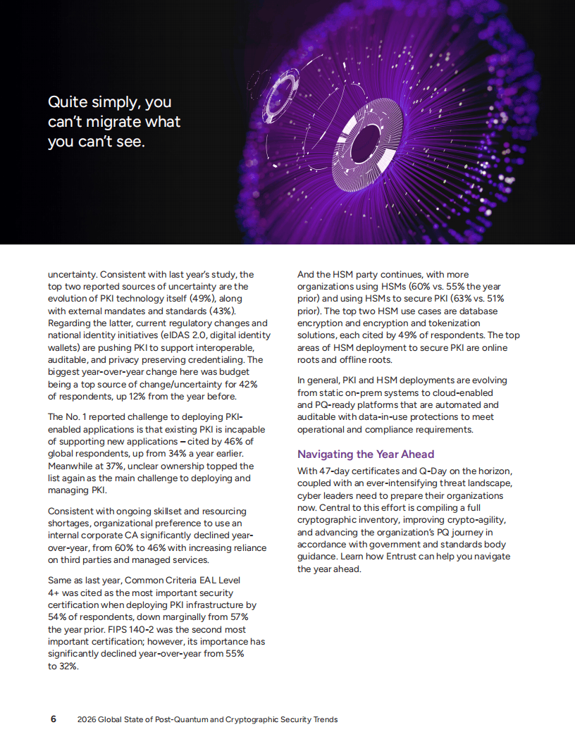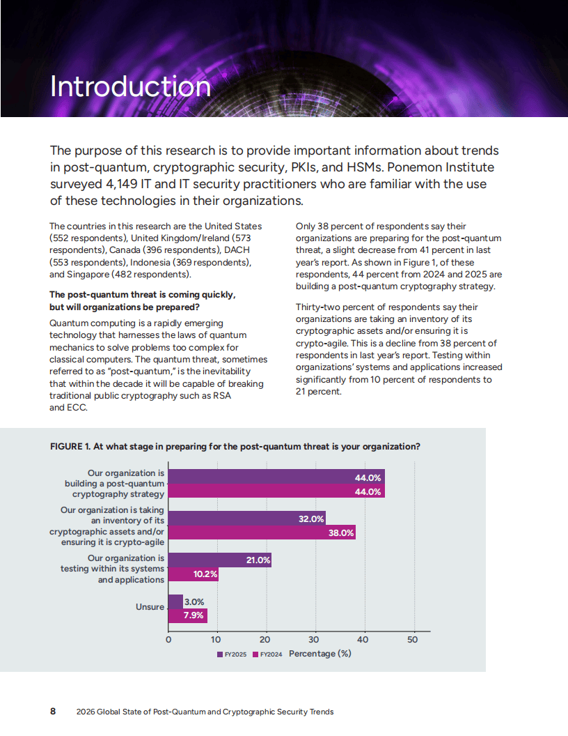 在那些已经开始行动的企业中,44%正在制定后量子密码学战略,32%正在进行密码资产盘点或确保密码敏捷性。然而,最大的挑战在于缺乏密码敏捷性——即系统能够通过配置或策略从一种密码系统过渡到另一种,而不影响周围基础设施的能力。目前只有26%的企业表示已完全实施了密码敏捷性战略。