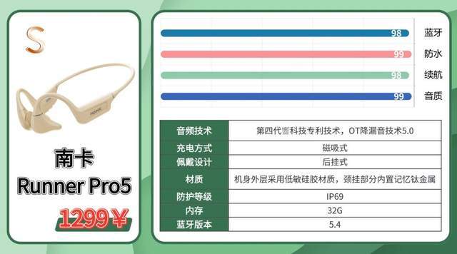 推荐理由:纽曼这款是入门骨传导的实用款,主打性价比和实用性,适合追求实用的入门人群。后挂式的设计贴在脖子上,运动怎么动都不晃,稳定性不错,日常跑步、跳绳都能戴。小尺寸“动态振子”HiFI技术,让音质比同价位的更清晰,声音的细节也多一点,日常听歌完全够用,比同价位的入门款音质更出色。IPX7的防水等级,出汗、淋雨都没事,日常轻运动、甚至偶尔掉水里都没问题,抗造性拉满。内置16G内存,能存两三百首歌,晨跑、夜跑不用连手机,彻底解放双手,运动更自在。29g的轻量化设计,戴起来没负担,单次10小时的续航,价格还超亲民,主打实用的入门款,性价比不错。