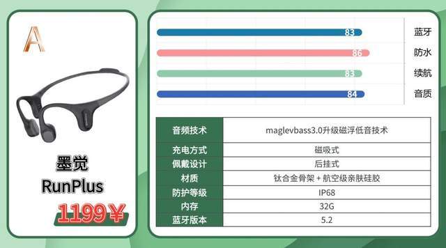 推荐理由:墨觉RunPlus后挂式的设计,运动、游泳都能戴,一机多用,不用为不同场景准备不同耳机,日常使用超省心。搭载maglevbass3.0磁浮低音技术,在骨传导耳机里,低频表现超出色,低频饱满有弹性、下潜到位,听动感音乐、流行歌超带劲,彻底摆脱骨传导低频单薄的问题。Ultralow超低漏音技术做得很到位,中等音量下听歌,旁边的人完全听不到,办公、学习佩戴也不会打扰别人,私密性拉满。IP68的顶级防水等级,游泳、洗澡都能放心戴,夏天玩水、运动出大汗都完全不用慌,抗造性拉满。内置32G大内存,能存上千首歌,晨跑、夜跑不用连手机,彻底解放双手。28g的超轻机身,戴在脖子上没负担,久戴也不累,还带ENC通话降噪,能过滤马路边、健身房的环境噪音,户外打电话也能清晰交流。