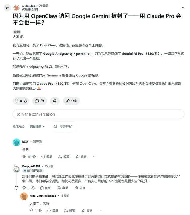 而就像图片中所展示的,面对Agent带来的恐怖吞吐量,率先感受到商业模式崩塌的还是西方AI巨头。大量开发者利用编程接口,让OpenClaw去“白嫖”一点通、Anthropic、OpenAI等公司每月仅20美元💵的个人订阅服务。很快,因算力资源被“薅秃”,巨头们被迫紧急出手。